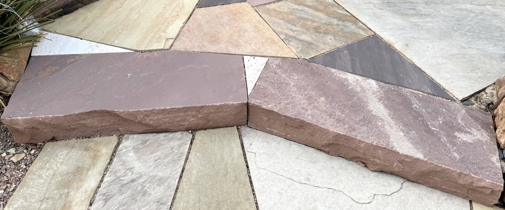 Stone steps work best as a single slab of stone, set so that the top surface is level left to right. Stone steps last longer if they rest on top of the step beneath them, with a 3″ overhang. I set steps into a bed of crushed gravel, compacted. I tilt steps slightly downhill so that rainwater and debris naturally flow downhill. This helps reduce the gathering of organic matter where the steps touch one another, and also helps prevent icing or puddles. Otherwise, plant matter tends to sprout there, starting the process of sending roots under the step.